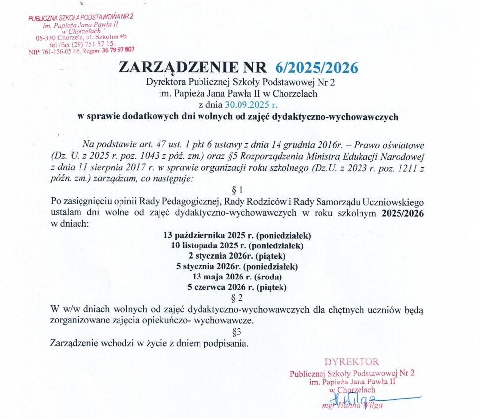 ZARZĄDZENIE O DNIACH WOLNYCH W ROKU SZKOLNYM 2018/2019